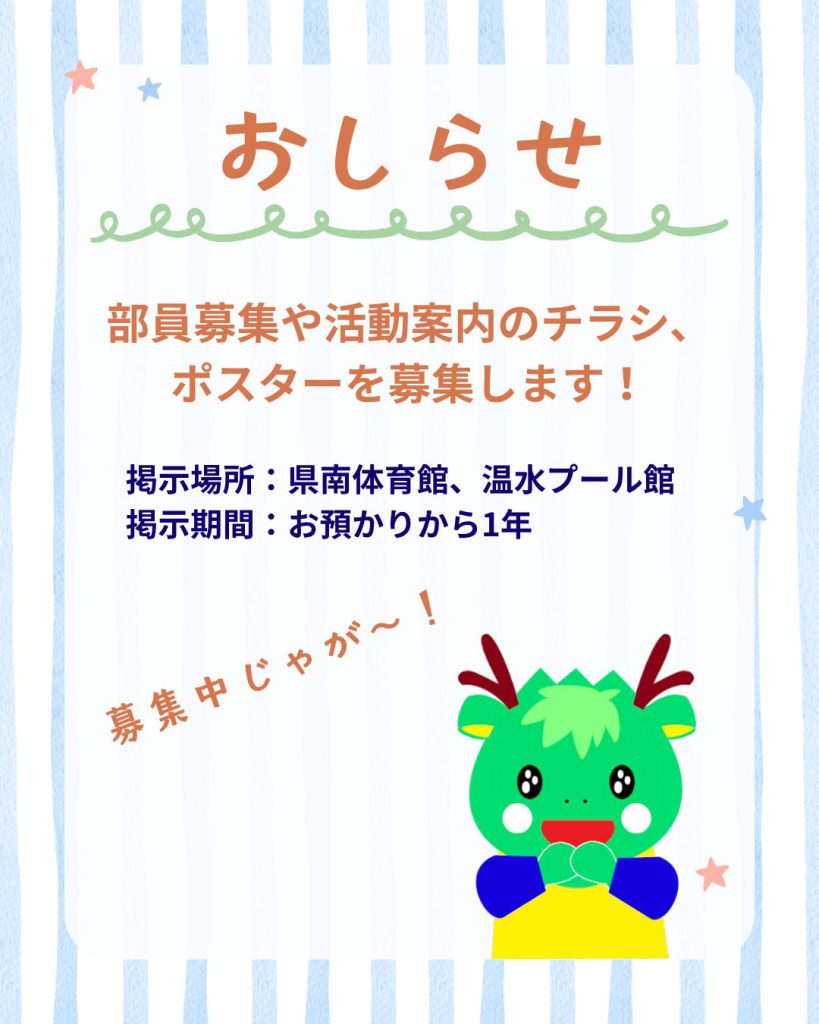 県南体育館、温水プール館内に部員・会員募集のチラシを掲示いたします。
